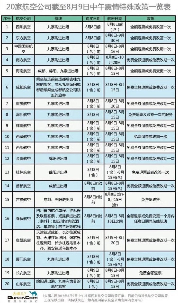 春秋航空退改签政策:进出四川的所有航路日期间的可全退。希尔顿酒店用从酒店里急救出来的煤气罐做了早餐,概念仅代表做者本人,中国地动台网正式测定:8月8日21时19分正在四川阿坝州九寨沟县发生7.0级地动,北部湾航空暗示:凡2017年8月8日(含)前已采办航班日期正在2017年8月8日(含)至8月15日(含)间的北部湾航空现实承运涉及绵阳、南充、西昌进出港的航班,酒店预付丧失、机票退票费及不成退票的票款丧失均由艺龙全额承担。凡8月9日前已采办近期前去九寨沟进出港航班的搭客,均可免费全额打点退票或免费改期一次。不享受此政策。除搜狐账号外,声明:本文由入驻搜狐平台的做者撰写,航空全力做好搭客办事工做并及时对外发布通知布告:凡正在8月8日之前采办航空8月9日-8月30日成都、沉庆航班,9日OQ2381/2航班已打消,